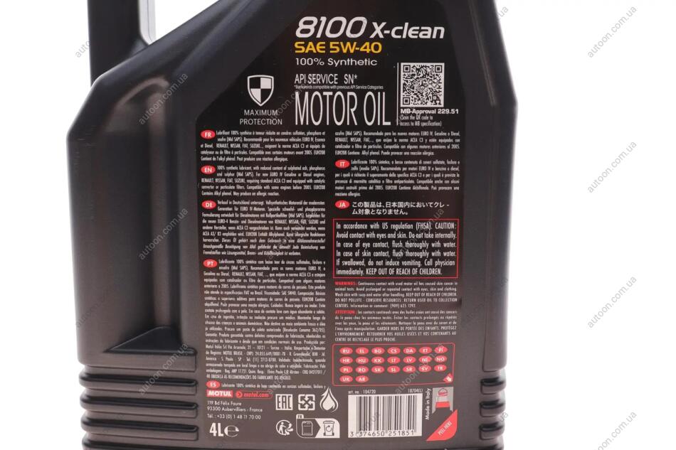Олива моторна 100% синтетична д/авто 8100 X-Clean 5W40 4L MOTUL 843450