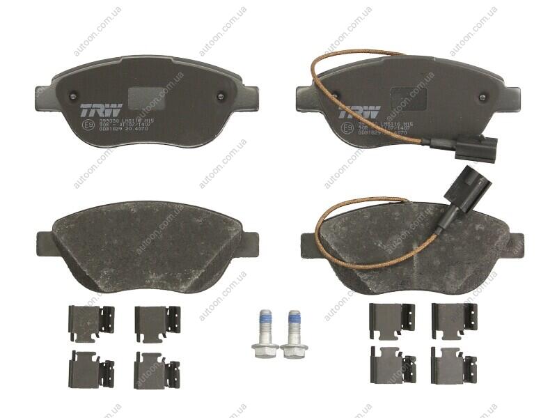 Комплект гальмівних колодок передн (з комплектуючими з гвинтами гальмівного супорта), ABARTH 500 / 595 / 695, 500C / 595C / 695C FIAT BRAVO, BRAVO II, DOBLO, DOBLO CARGO 1.3D-2.0D 04.99- TRW GDB1829